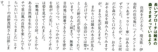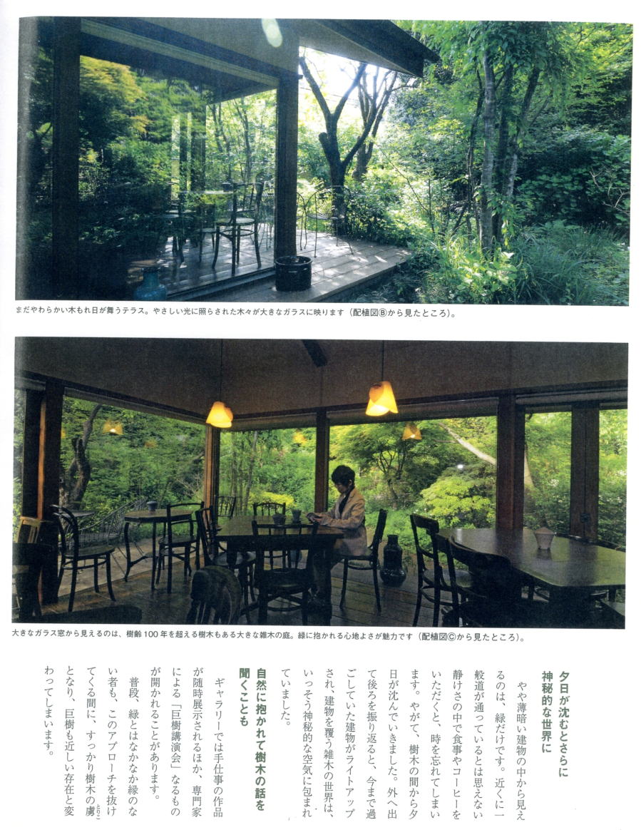 カキやソロなどの大木の足もとにはホトトギス、ホタルブクロ、シラユキゲシ、シモツケソウなど高低差をつけた下草に(配置図Aから見たところ)。