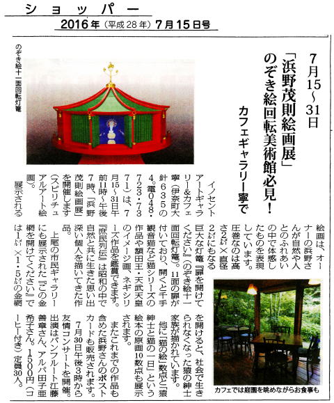 | 「東京新聞ショッパー」(2016年7月15日付)で 「浜野茂則絵画展」 のぞき絵回転美術館必見! 紹介されました。 |